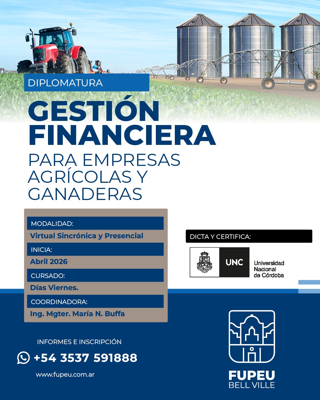Nueva propuesta de FUPEU y la Facultad de Ciencias Agropecuarias de la UNC para 2026. Formación estratégica diseñada para optimizar la rentabilidad y toma de decisiones en el sector agropecuario. Aprenderás a gestionar flujos de fondos, diseñar estrategias de financiamiento y manejar el riesgo financiero.